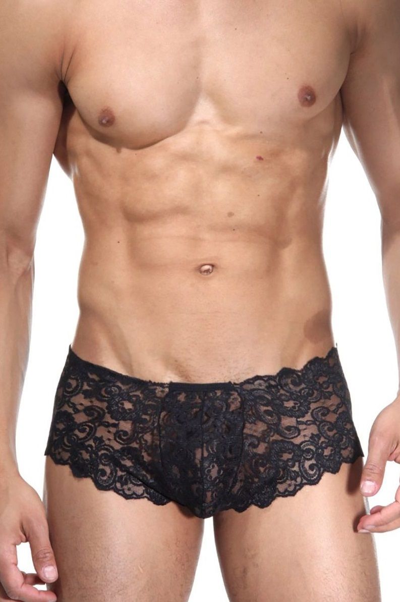 Мужское кружевное белье из мягкой и эластичной ткани черного цвета. Трусы плотно прилегают к телу, но при этом не доставляют никакого дискомфорта. Прекрасно украсят и дополнят любой образ и так же отлично смотрятся в одиночку.
