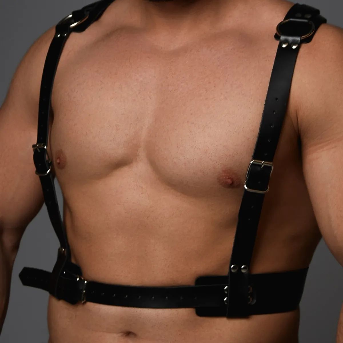 Черная кожаная мужская портупея с регулируемыми ремешками. На спинке красивое Y-образное соединение кольцами.