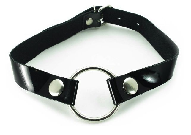 Кляп в виде открытого кольца на лаковом ремешке, изготовленном из качественной кожи. Для регулировки длины кляпа на ремешке имеется 6 отверстий. Ширина ремешка - 2 см. Диаметр кольца - 4,5 см.