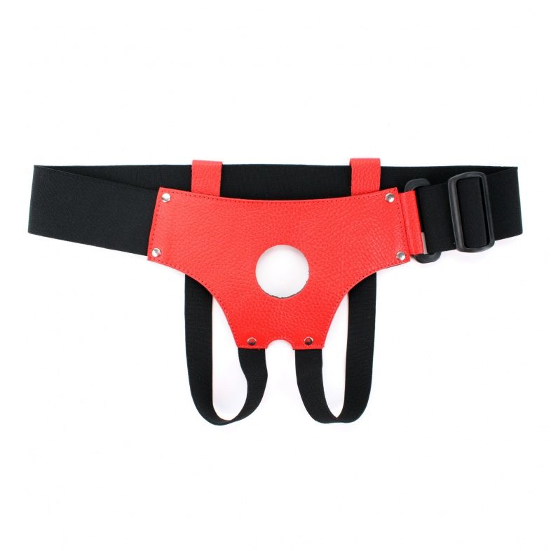 Красные кожаные трусики с отверстием для крепления страпона.